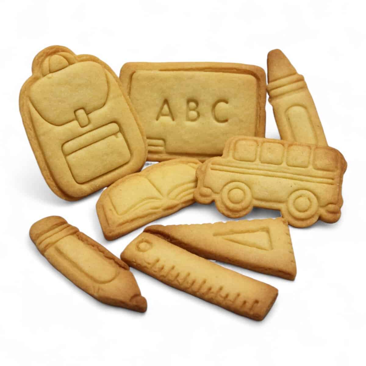 Una confezione da 150 g di biscotti di biscotti con libri, zaino, matite, pennarelli, righello, lavagna, scuolabus e squadra. Deliziosi biscotti di pasta frolla friabili e dorati, con l’aggiunta di un tocco di creatività che rende i biscotti unici nel loro genere. Ideali da gustare a colazione o merenda.